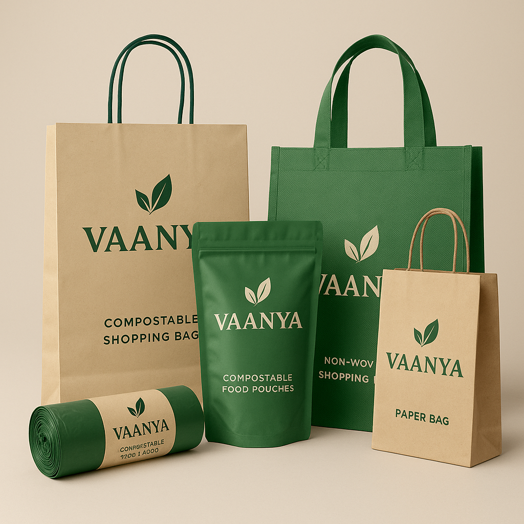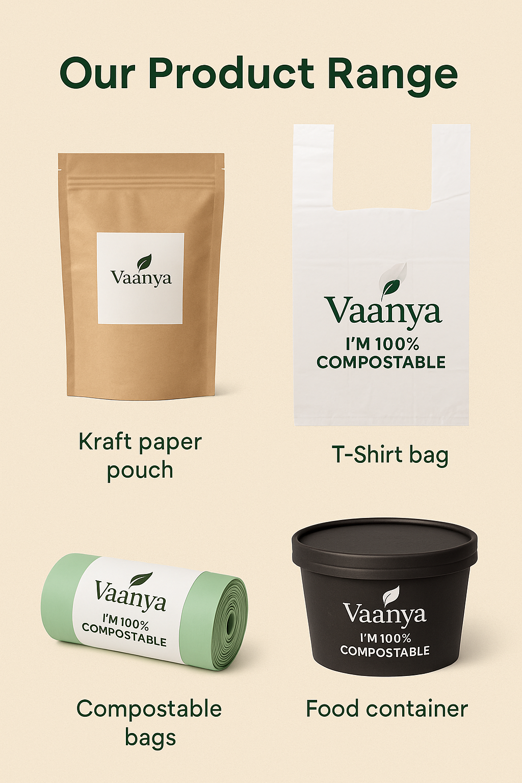 All our products are made from certified compostable, biodegradable, and recycled materials like PLA, cornstarch blends, kraft paper, and spunbond non-woven fabric—ensuring minimal environmental impact.
